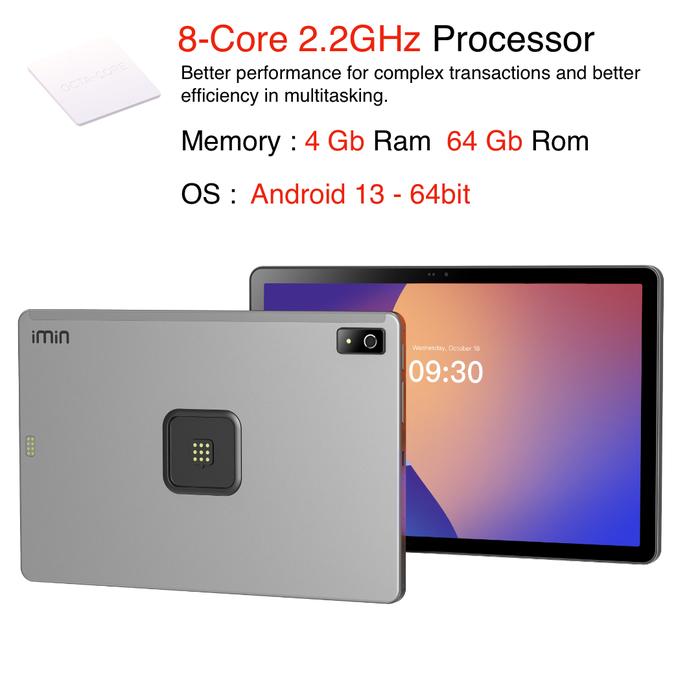 Ditenagai prosesor Octa-core (Dual-core Arm Cortex-A76 2.2GHz + Hexa-core Cortex-A55 2.0GHz) serta RAM 4GB dan penyimpanan 64GB, perangkat ini siap menjalankan aplikasi kasir maupun sistem manajemen bisnis tanpa hambatan. Dukungan Android 13 (64-bit) memastikan sistem lebih aman dan responsif.
