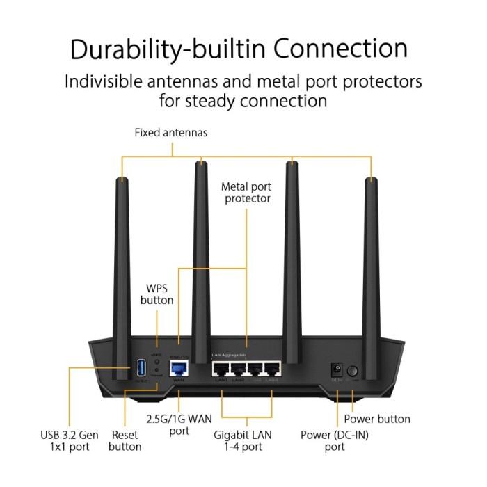 Desain kokoh khas seri TUF menambah nilai lebih untuk penggunaan jangka panjang. Router ini juga mendukung AiMesh, memungkinkan Anda memperluas jaringan dengan menghubungkan router ASUS lainnya menjadi sistem mesh seamless.